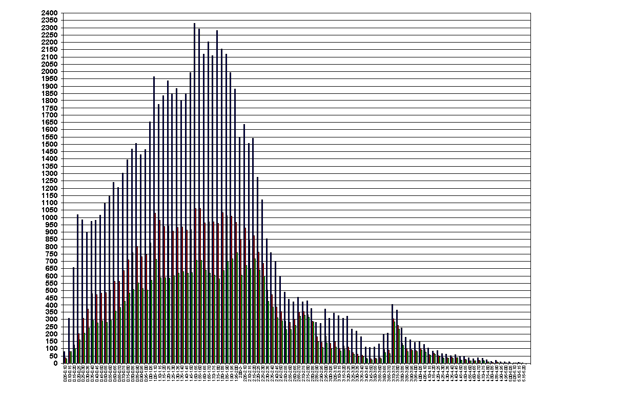 March 11, 2006 QSO's with published redshift now number nearly 90,000. This new histogram combines all three distribution surveys. Peaks still line up fairly closely; the "3.75 peak" is still strong, and the dramatic drop-off in QSO numbers at higher z is still evident. Notably, at the time of the last survey 2 years ago only 6 objects were found at z 6 or greater. No further objects in this range have since been identified, despite a doubling of the sample size.